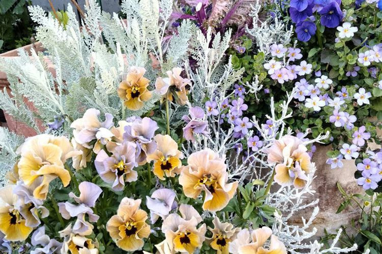 エリゲロン、ジギタリスを中心にオキザリス、オダマキ、バーベナ、矢車草、千鳥草、カンパニュラ等色にこだわった草花やホスタを植栽しています